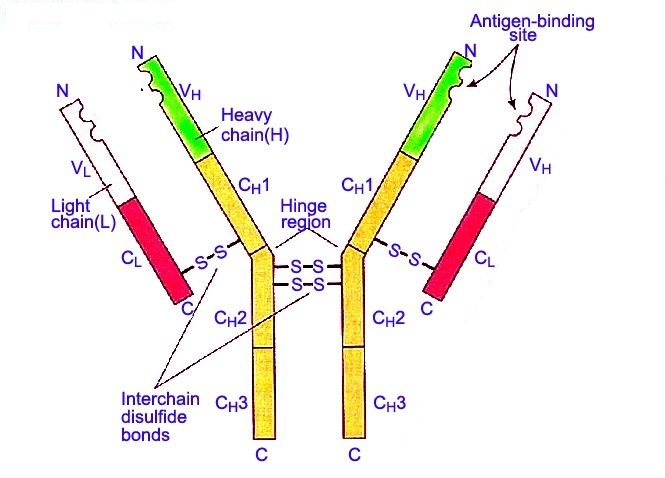 哺乳动物抗体(Ig)的重链一共分为5种,分别用希腊字母α、δ、ε、g和μ来命名,相对应组成的5种抗体分别称为IgA、IgD、IgE、IgG和IgM。不同的重链在大小和组成上有所区别,α、δ和g型重链包含大约450个氨基酸,而μ和ε则有大约550个氨基酸。每个重链有两个区:恒定区(C H )和可变区(V H )。所有同一型的抗体其恒定区都是相同的,不同型的抗体恒定区之间则存在差异。重链α、δ和g的恒定区的组成为3个前后串联的Ig结构域(C H 1、C H 2和C H 3),并有一个铰链区增加抗体各区域的灵活性;重链μ和ε的恒定区则由4个Ig结构域组成(C H 1、C H 2、C H 3和C H 4)。不同B淋巴细胞产生的抗体其重链的可变区不同,但同一种B细胞产生的抗体可变区则是相同的,每一个重链的可变区都是大约为110个氨基酸,并组成一个单独的结构域。