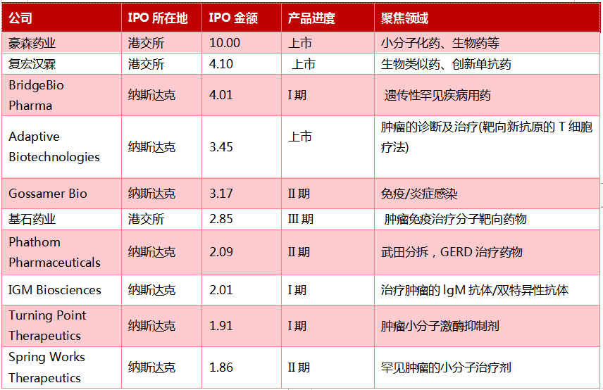 从IPO融资金额看,豪森药业、复宏汉霖和基石药业3家在港交所IPO的中国生物制药企业入围TOP10榜单。
