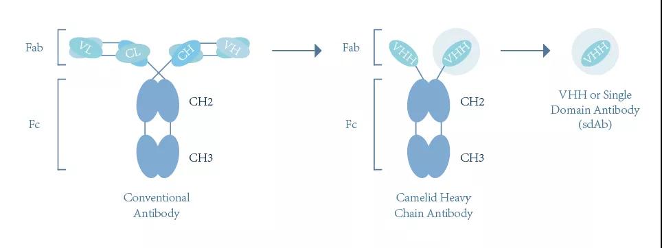 纳米抗体最早由比利时科学家 Hamers 等1993 年在《Nature》首次报道。在羊驼外周血中存在一种天然缺失轻链的抗体,该抗体只包含一个重链可变区(VHH)和两个常规的CH2与CH3区,该抗体是已知的可结合目标抗原的最小单位。VHH晶体为2.5nm,长4nm,分子量只有15KD,因此也被称作纳米抗体(Nanobody或single domain antibodody)。